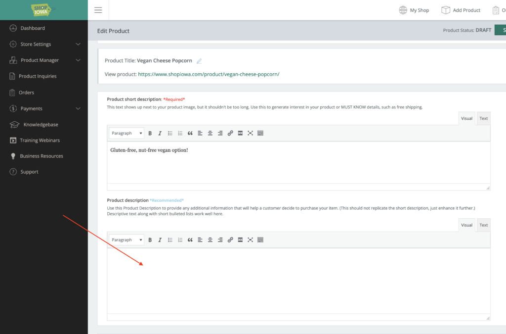 After you’ve copied that URL, simply paste it into the Product Description field on your product.