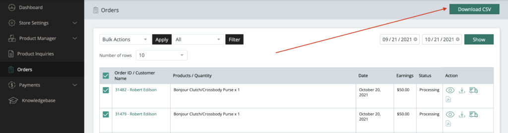 Once you have your orders selected, click the “Download CSV” button as show below:
